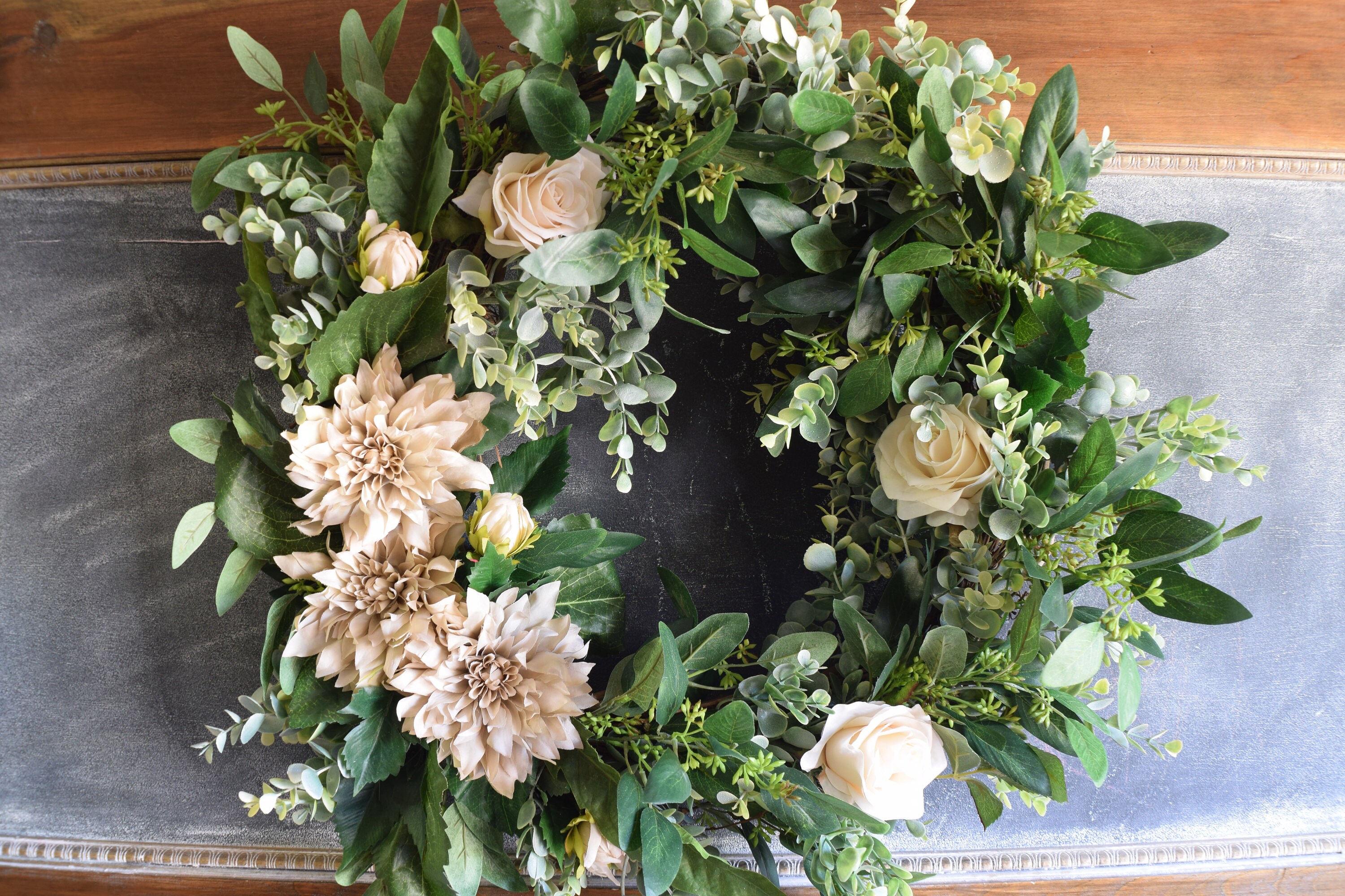 Beige Dahlia Rose And Eucalyptus Wreath Etsy Uk